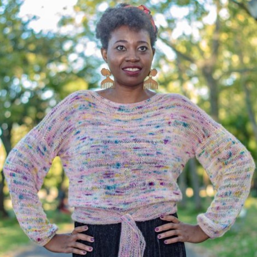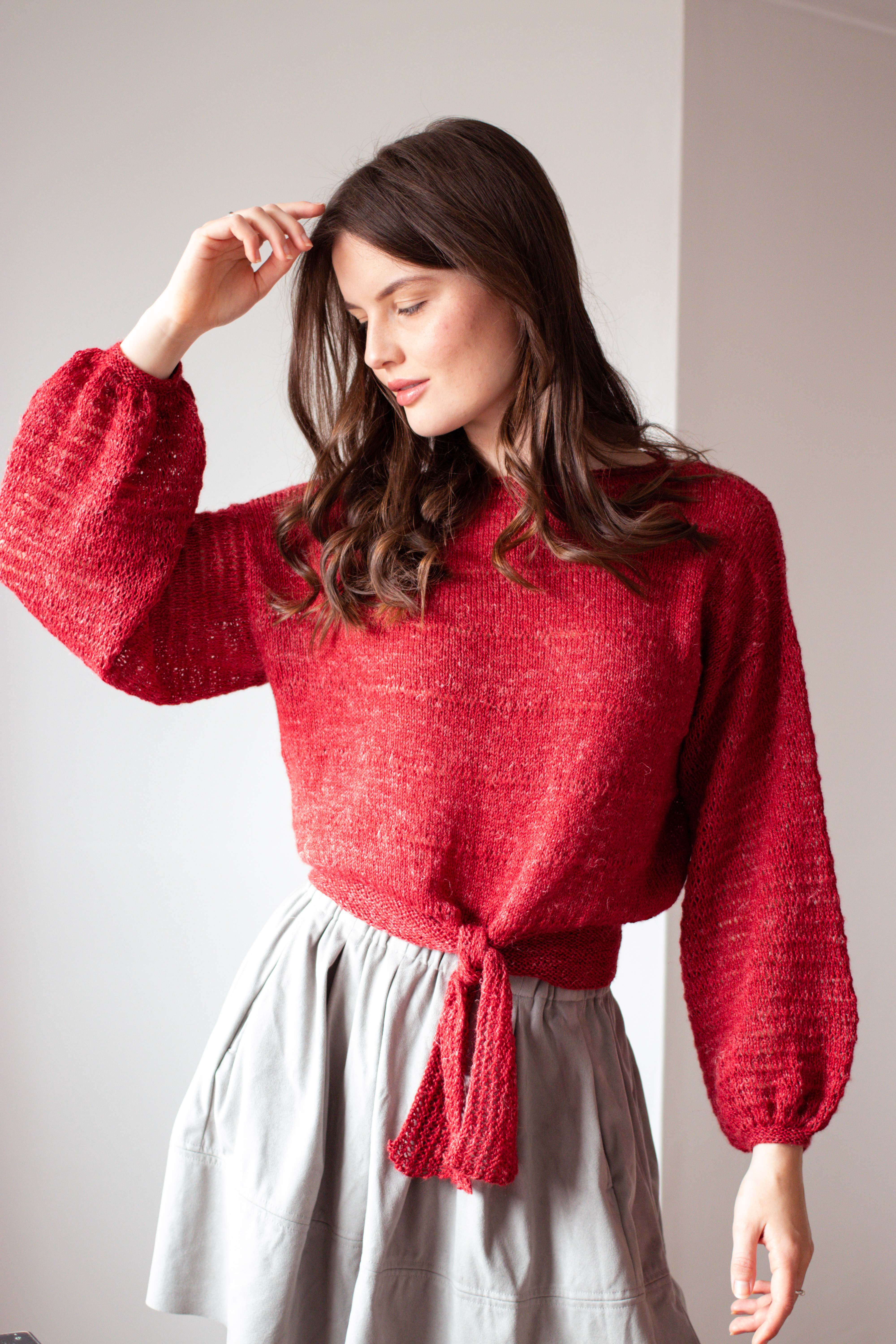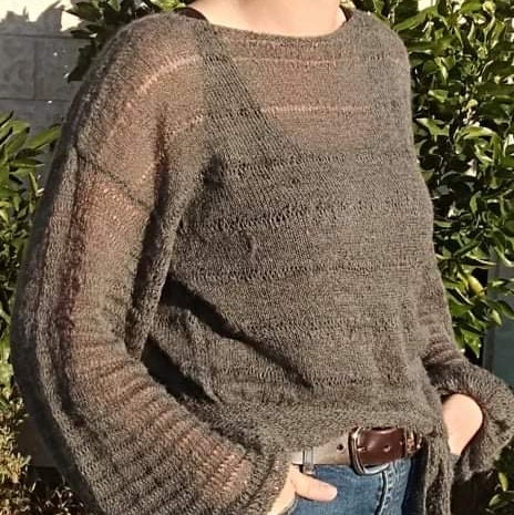 Yarn choices: a heavy laceweight or light fingering weight yarn is knitted to a loose gauge for an airy fabric. The sample yarn used is a combination of animal and plant fibres with a good amount of drape. It is worth keeping in mind that a heavier yarn will make for a weightier fabric, therefore you may need to shorten the body and sleeves to account for stretching.