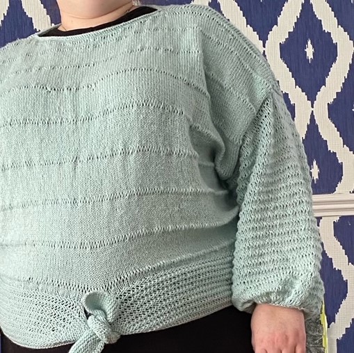 Construction: the Erinome Sweater is worked seamlessly from the top down with dropped shoulders, a tie waistband, and gathered cuffs.