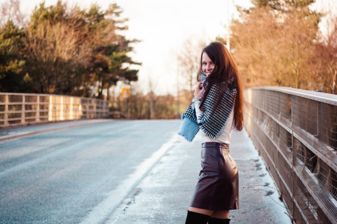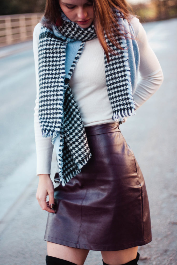 scarf: River Island | skirt: Matalan | boots: ASOS (mine are the tall version, but also available in regular, petite, wide fit and wide leg) | top: Primark | coat: New Look | earrings: Lovisa