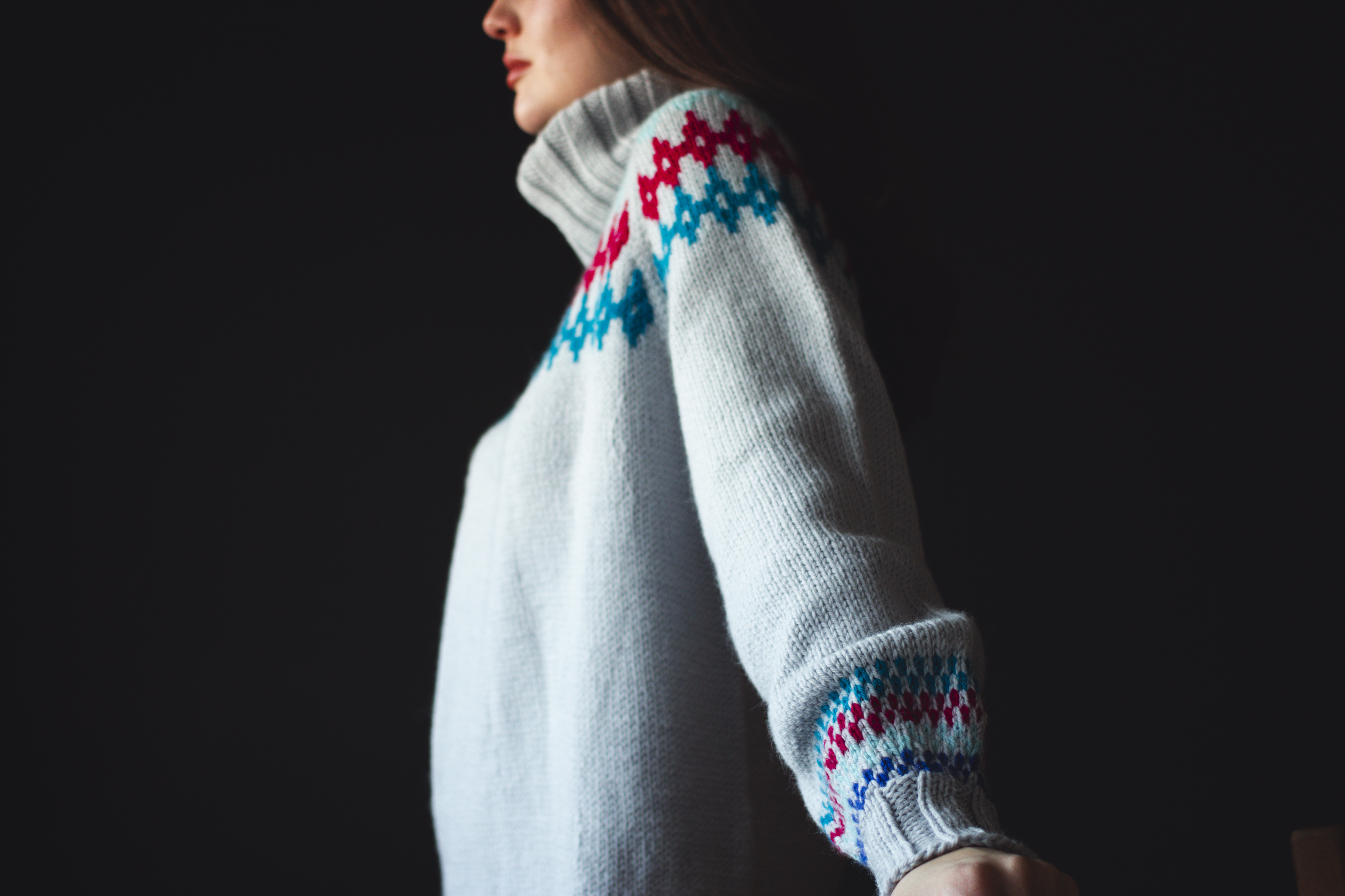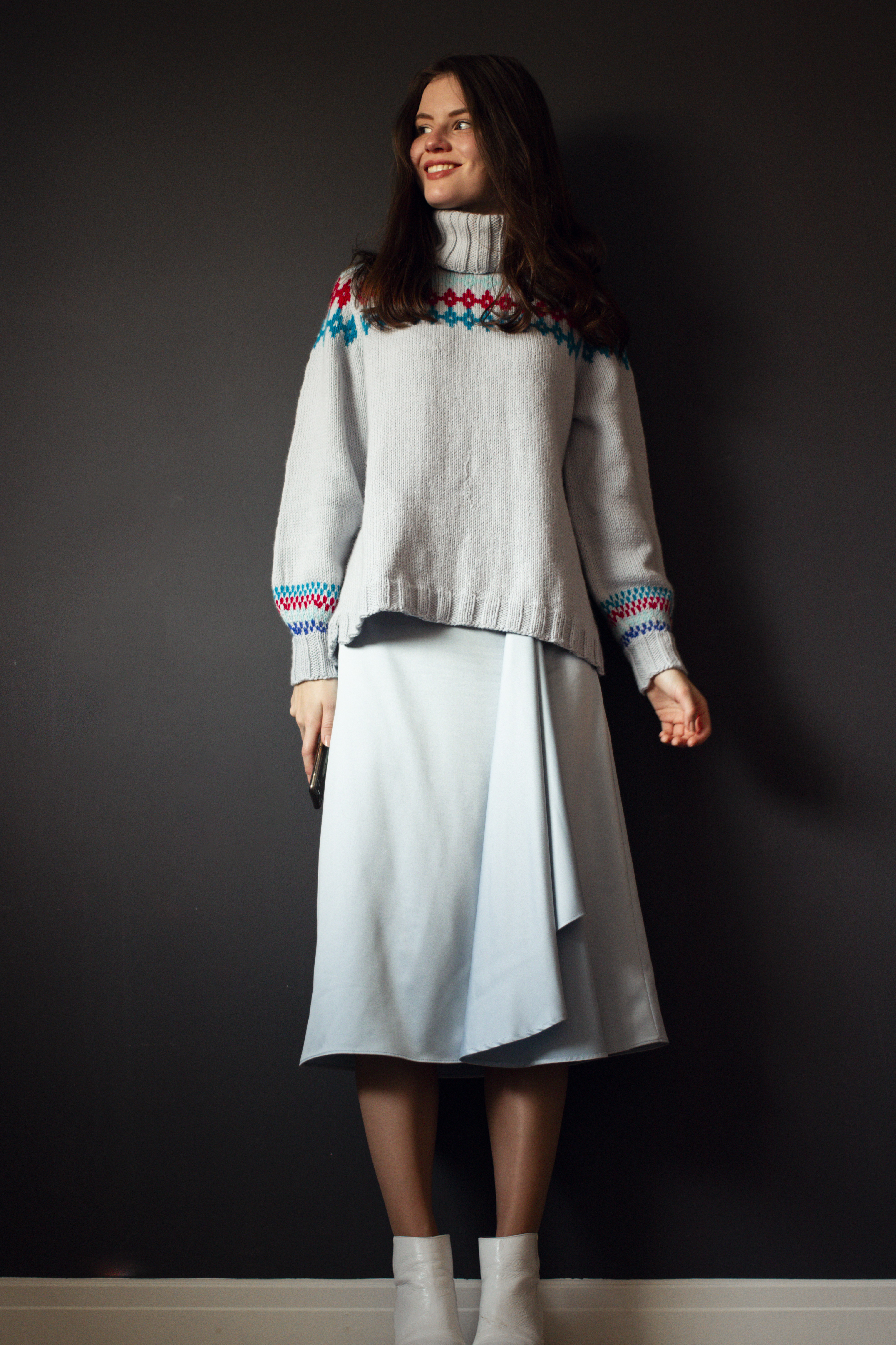 Speaking of Iceland, I cast on in a hurry as soon as the yarn arrived, thinking I’d knit up a sweater to wear in Iceland in December. How perfect would it have looked against a dramatic Icelandic waterfall, or in a cosy coffee shop in Reykjavik? Alas, said Iceland trip did not happen, as my boyfriend injured his back days beforehand and I didn’t fancy a solo trip with 4 hours daylight. Hopefully this year. So the sweater was photographed in the dining room instead.